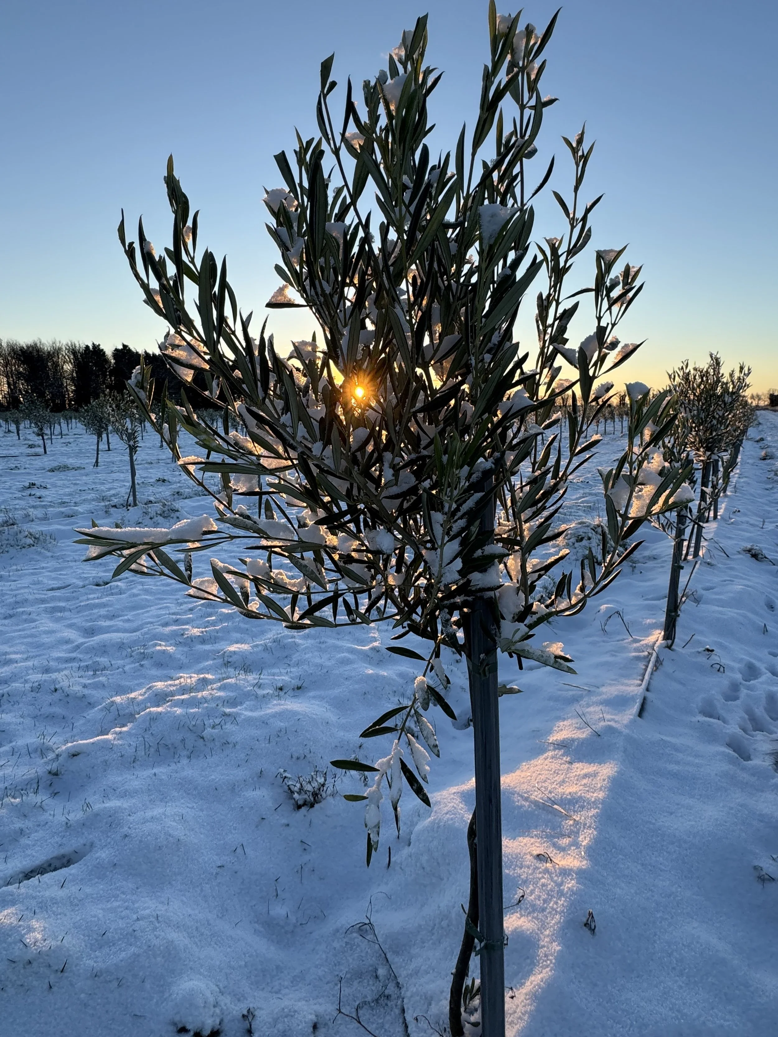 Snow covered and frosty conditions hit the olive grove in the first week of January.