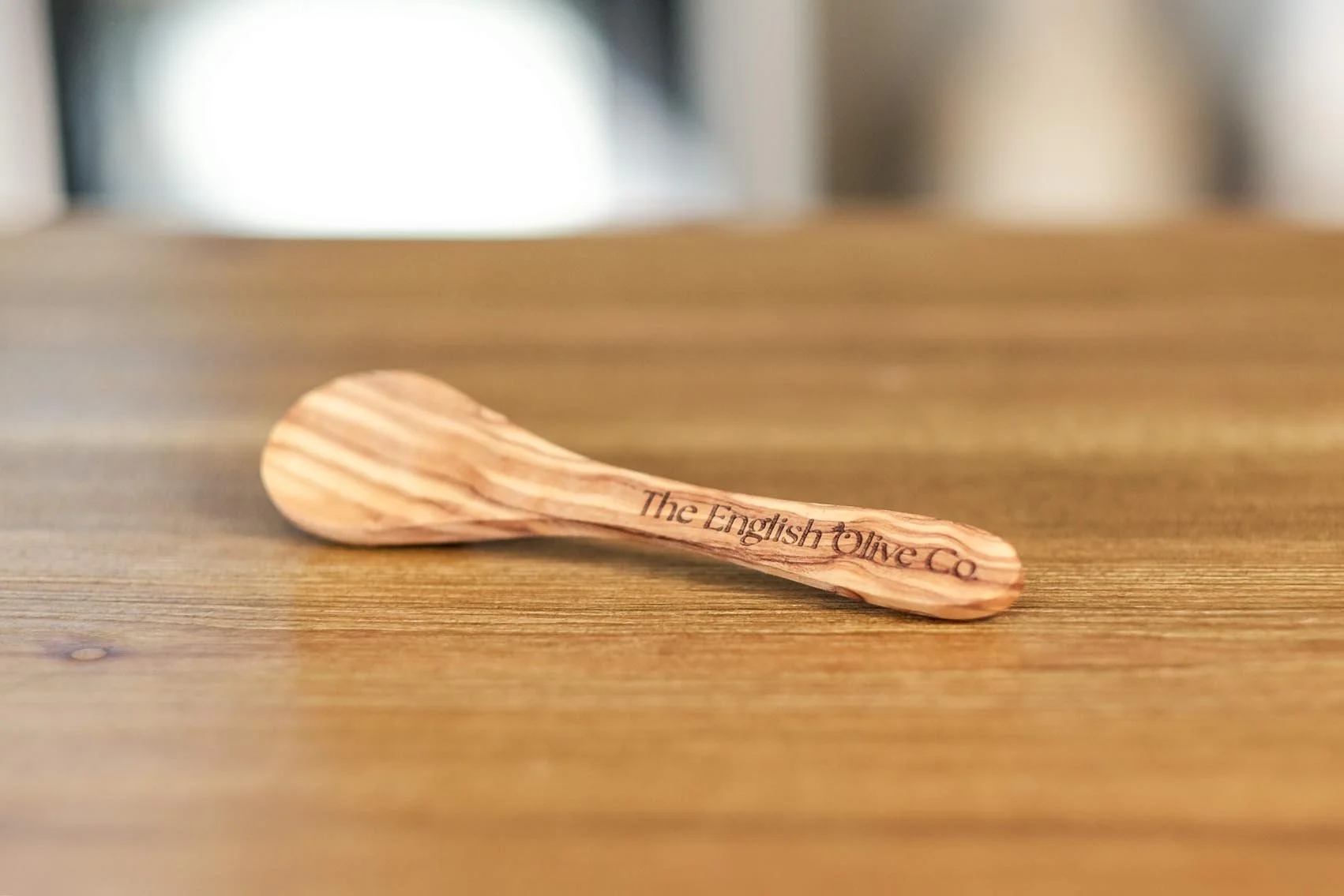 Olive wood Condiment Spoon. Ideal to use in jam and condiment jars. Each piece is unique, with stunning grain patterns and colour. Length 14cm.